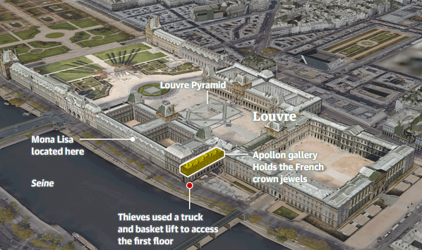 За даними французьких ЗМІ, двоє одягнені, як будівельники у жовтих жилетах безпеки на вантажівці з підйомником – люлькою та двоє на скутері – прибули до музею на набережній Франсуа Міттерана. Вони скористалися підйомником, щоб потрапити до галереї Аполлона, де розбили вікно дисковою пилкою. Потім тим самим інструментом зламали дві вітрини: одну з прикрасами Наполеона, іншу — з прикрасами французьких монархів, і викрали ювелірні вироби. Злочинці спустилися тим же чином та втекли на двох скутерах.